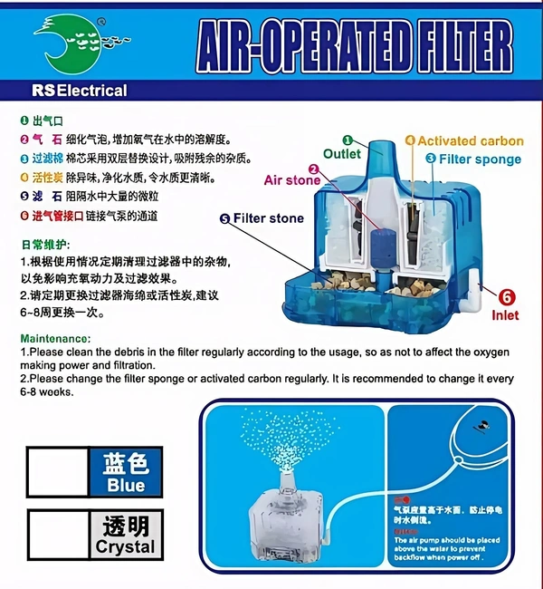 Keep your aquarium crystal clear and your fish happy with the RS-04B Air-Operated Filter, designed to deliver superior filtration with eco-friendly efficiency. This compact yet powerful filter is perfect for aquariums ranging from 10 to 50 liters, offering multi-layer purification to maintain optimal water quality for your aquatic pets.