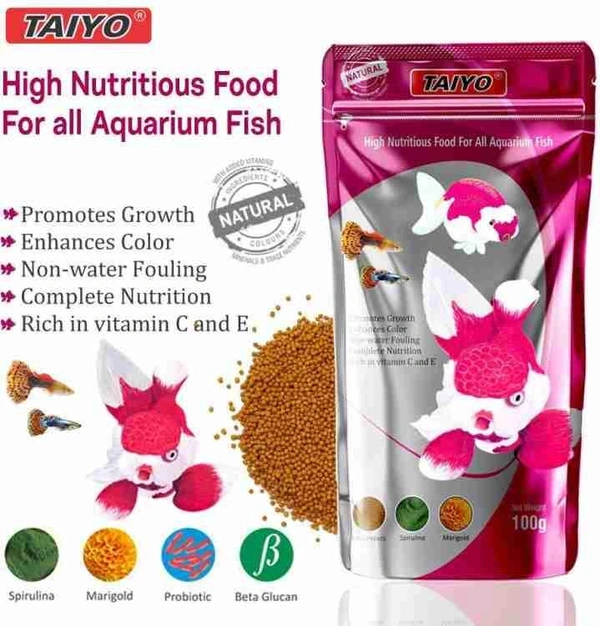General: Brand- TAIYO Model Number- Pink_100 Pet Type- Fish ,Model Name- Pink Fish Food for All FISHES Food Type- Dry Suitable For- Adult, Young Flavor- Fish